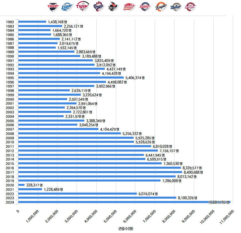 2025년 KBO 리그는 3월 22일 개막하며, 지난해 처음으로 1,000만 관중을 돌파한 성과를 이어갈 것으로 기대됩니다. 2024년 시즌에는 총 1,088만 7,705명의 관중이 입장하여 프로스포츠 역사상 최초로 연간 1,000만 관중을 기록했습니다.