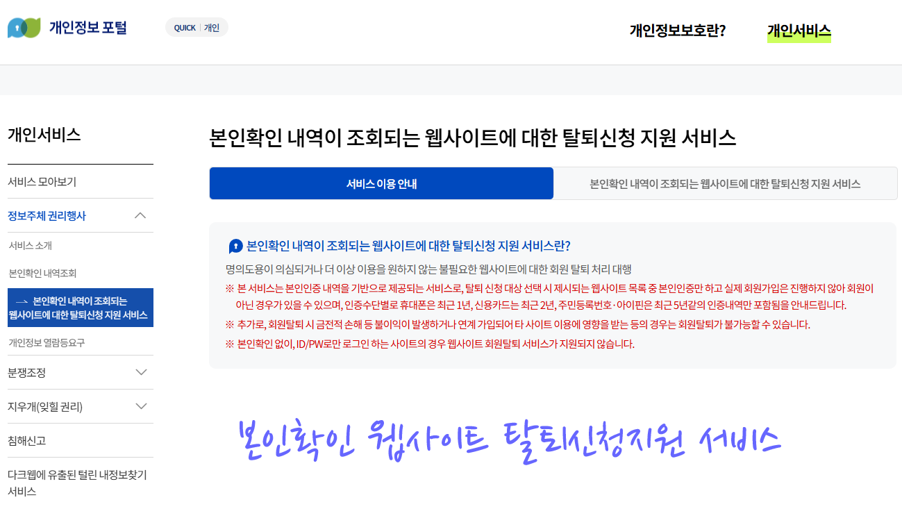 - 웹사이트 가입 현황 확인 : '웹사이트 탈퇴 신청' 서비스를 통해 자신이 가입한 웹사이트 목록을 확인합니다.