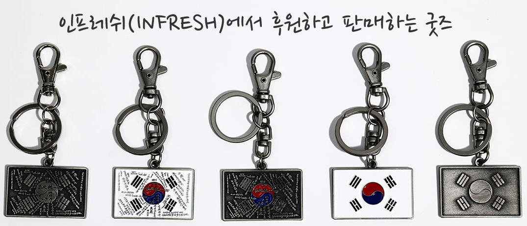 - 인프레쉬 태극기 키링 : 이 제품은 ₩29,000에 판매되며, 특별 기획 후원 굿즈로 제공됩니다.