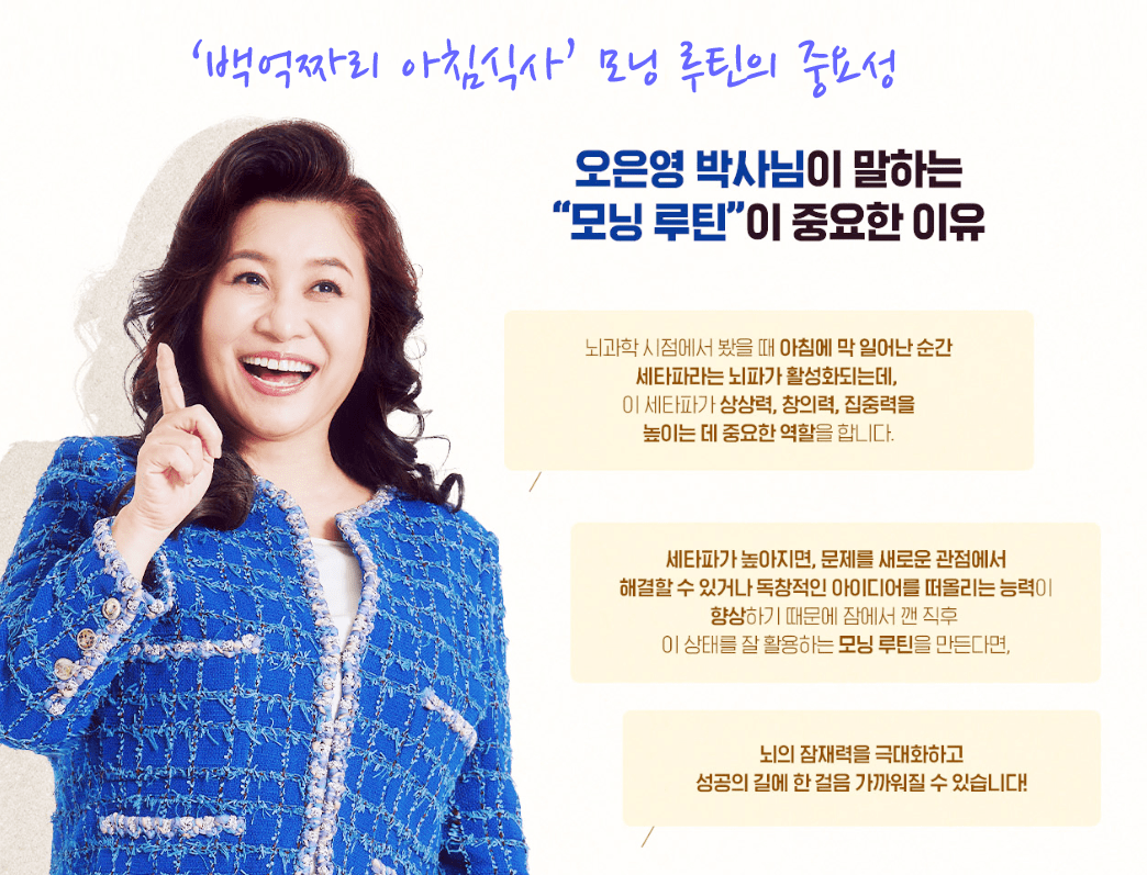 "백억짜리 아침식사" 프로그램의 기획 의도는 성공한 사람들의 아침 루틴을 공유하여 시청자들에게 긍정적인 영향을 주고, 하루를 효과적으로 시작하는 방법을 제시하는 것입니다. 이를 통해 시청자들이 자신의 삶에 적용할 수 있는 실질적인 팁과 영감을 제공하는 것이 핵심 목표입니다.