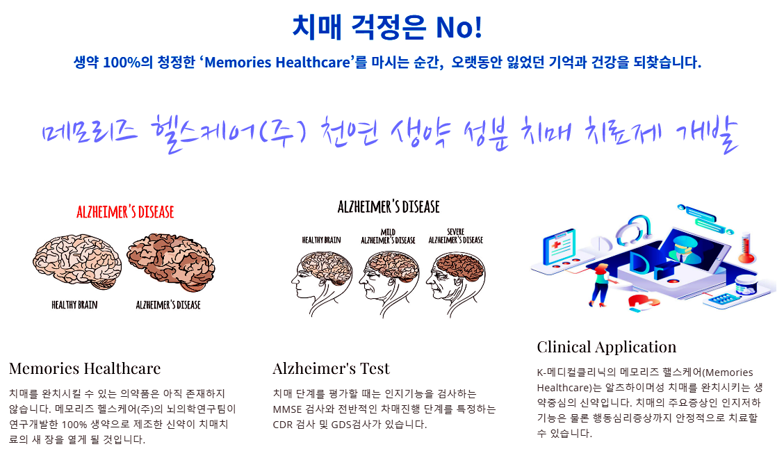 메모리즈 헬스케어는 기존의 한방 치료법을 바탕으로 다양한 약물 치료법을 개발하고 있으며, 알츠하이머병 환자를 위한 전문 병원인 ‘K-Medical Clinic’을 설립하여 10년간 환자들을 집중적으로 관리하며 치료제를 지속적으로 보완해 왔습니다.