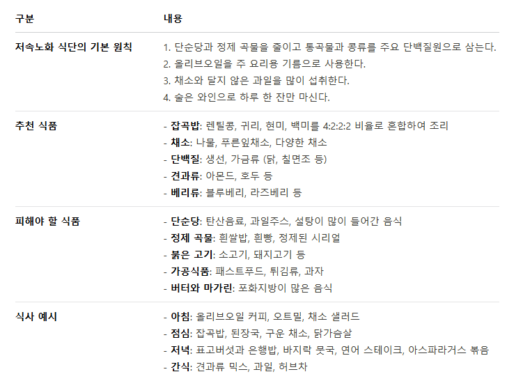 이 글을 통해 저속노화 식단의 중요성과 실천 방법을 이해하고, 건강한 삶을 위한 첫걸음을 내딛기를 바랍니다. 이번 한 주도 건강하고 행복하게 보내세요!