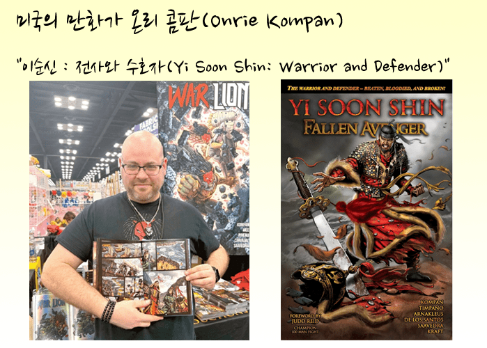 온리 콤판(Onrie Kompan)은 미국의 만화가로, 주로 한국의 역사적 인물인 이순신을 주제로 한 만화 시리즈로 잘 알려져 있습니다. 그의 작품은 "이순신 : 전사와 수호자(Yi Soon Shin: Warrior and Defender)"라는 제목으로, 이순신 장군의 일대기를 다루고 있습니다.