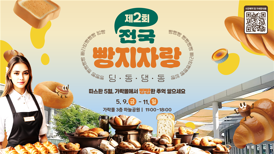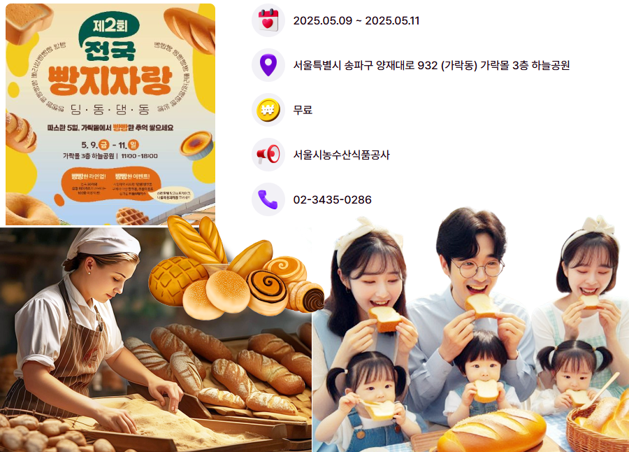 안녕하세요, 전국의 빵 애호가 여러분! 오늘은 2025년 5월 9일부터 11일까지 서울 송파구 가락몰 하늘공원에서 열리는 제2회 전국 빵지자랑에 대해 소개해 드리겠습니다. 이 행사는 전국의 유명 베이커리들이 한자리에 모여 다양한 수제빵을 선보이는 특별한 축제입니다. 빵을 사랑하는 모든 분들에게 잊지 못할 경험이 될 것입니다.