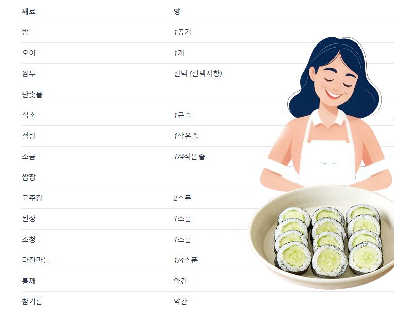 이 김밥은 주로 여름철에 인기를 끌며, 신선한 오이의 아삭한 식감과 함께 상큼한 맛이 특징입니다.
