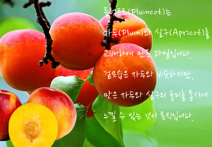 플럼코트(Plumcot)는 자두(Plum)와 살구(Apricot)를 교배하여 만든 과일입니다. 농촌진흥청에 따르면 자두와 살구의 장점을 모두 가지고 있으며, 달콤하고 부드러운 맛이 특징입니다.