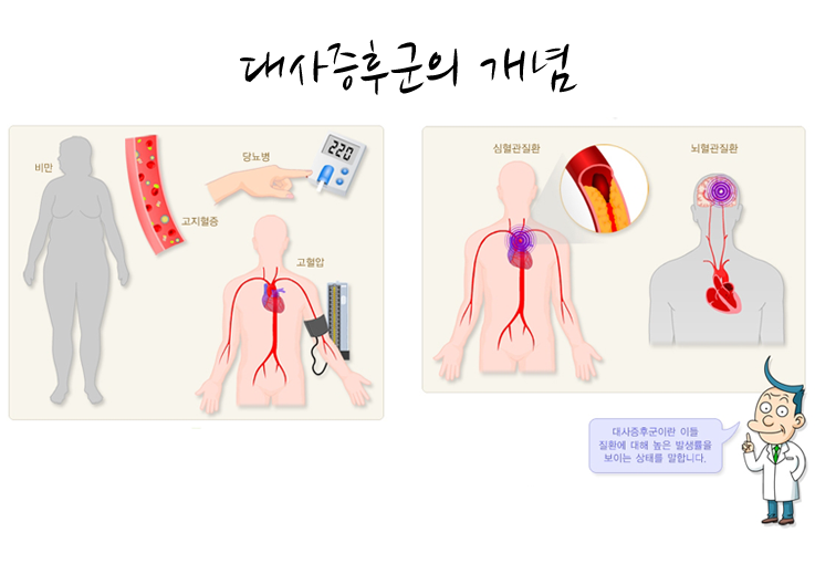 대사증후군이란 한 사람에게 혈압상승, 고혈당, 혈중지질이상, 비만(특히, 복부비만) 등 심뇌혈관질환 및 당뇨병의 위험을 높이는 위험인자가 겹쳐 있는 상태를 가리킵니다. 대사증후군은 단일한 질병이 아니며, 유전적 소인과 환경적 인자가 더해져 발생하는 포괄적 질병입니다. 대사증후군은 당뇨병, 고혈압, 만성콩팥병, 심뇌혈관질환 발생 위험도를 높이며, 유방암, 직장암 등 각종 암 발생 및 사망률과도 관계가 있습니다. 따라서 대사증후군이 있는 환자들을 조기에 발견하여 생활습관관리 등을 통해 이러한 질병의 위험도를 감소시키는 것이 중요합니다.