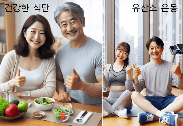 ● 운동 : 유산소 운동과 근력 운동을 병행하여 내장 지방을 태우고 근육량을 늘리는 것이 효과적입니다.