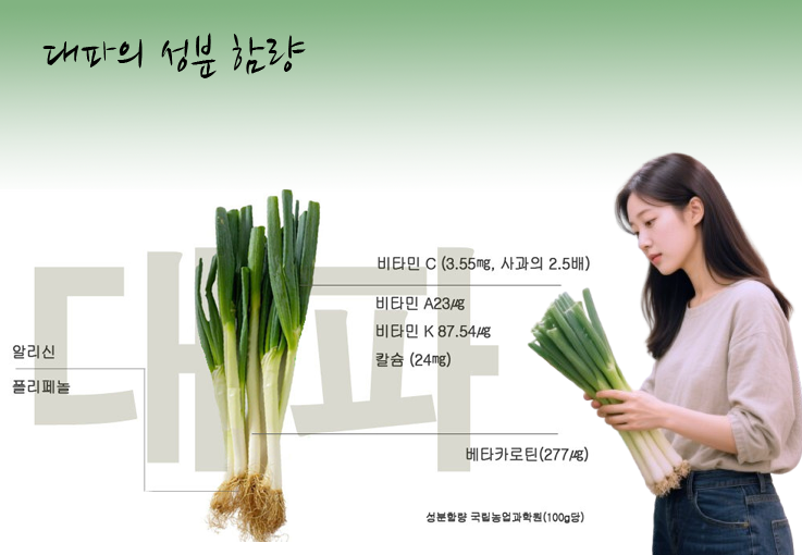 ● 뼈 건강과 항암 효과 : 대파에 함유된 칼슘과 인은 뼈 건강을 튼튼하게 유지하는 데 기여하며, 플라보노이드와 같은 항산화 성분은 활성산소를 제거해 암세포의 성장을 억제하는 데 도움을 줄 수 있습니다.
