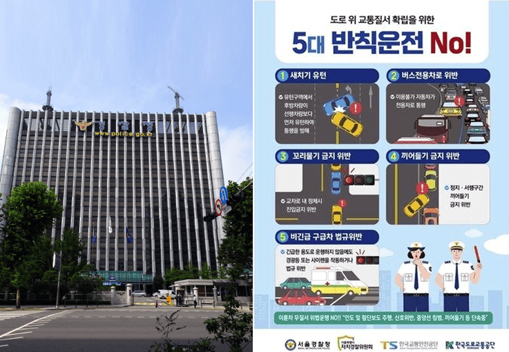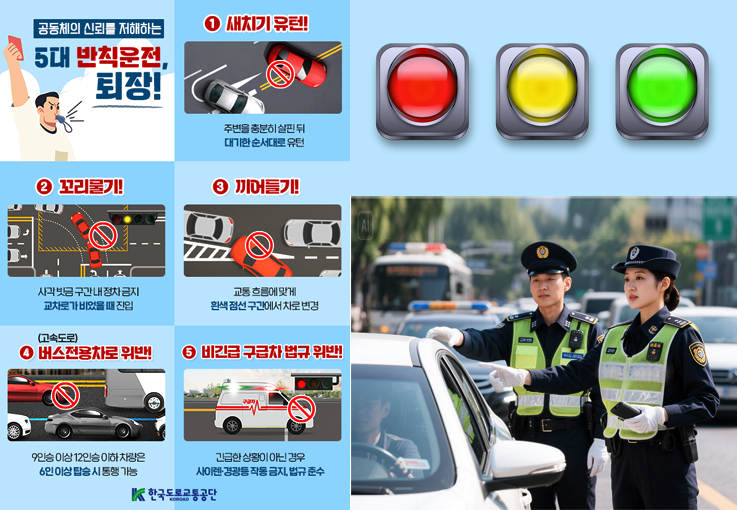 우리 모두 오늘부터 꼬리물기, 끼어들기, 새치기 유턴, 버스전용차로 위반, 비긴급 구급차 교통법규 위반 등 5대 반칙 운전을 하지 않도록 스스로를 돌아보고, 안전 운전 습관을 생활화합시다. 나의 작은 실천이 대한민국 도로의 품격을 높이는 큰 변화를 만들어낼 수 있습니다.