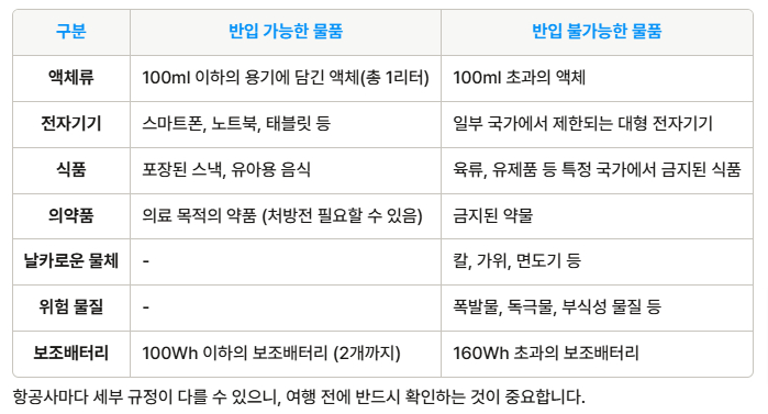 항공기 기내 반입이 가능한 물품과 불가능한 물품을 구분
