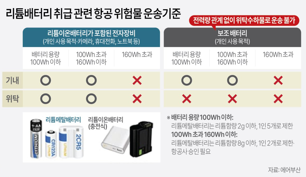 항공 위험물 운송기준에 따르면, 리튬 메탈 배터리와 리튬 이온 배터리는 위험물로 분류되어 기내 반입이 제한됩니다. 다만, 사용 목적의 소량 반입은 허용됩니다: