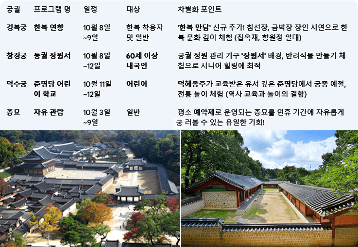 4대 궁, 종묘, 국립현대미술관(MMCA), 완도수목원 등 주요 무료 개방 명소의 기간, 핵심 프로그램, 그리고 방문 꿀팁까지! 이 글 하나로 2025년 추석 연휴 여행 계획을 완벽하게 완성해 보세요!