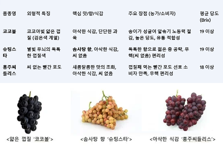 민관 협력으로 탄생한 국산 포도 신품종 '코코볼', '슈팅스타', '홍주씨들리스'가 그 주인공입니다. 이들은 샤인머스켓처럼 '껍질째 먹는 포도'의 편리성을 갖추었을 뿐만 아니라, 기존 포도에서 경험할 수 없었던 독특한 향, 색깔, 식감을 무기로 포도 시장의 판도를 재편하고 있습니다.
