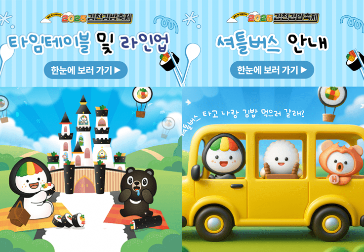 ● 교통 혁신 : 작년 10대였던 셔틀버스가 5배 늘어난 50대로 대폭 확충되었습니다. KTX김천구미역과 김천 시내 주요 지점에서 셔틀버스를 이용할 수 있으며, 셔틀버스 탑승객에게는 김밥 1,000원 할인 쿠폰까지 제공하여 대중교통 이용을 적극적으로 유도하고 있습니다. 축제 장소와 주차장 규모 역시 작년 대비 5배로 확장되어 혼잡도를 크게 낮출 것으로 보입니다.