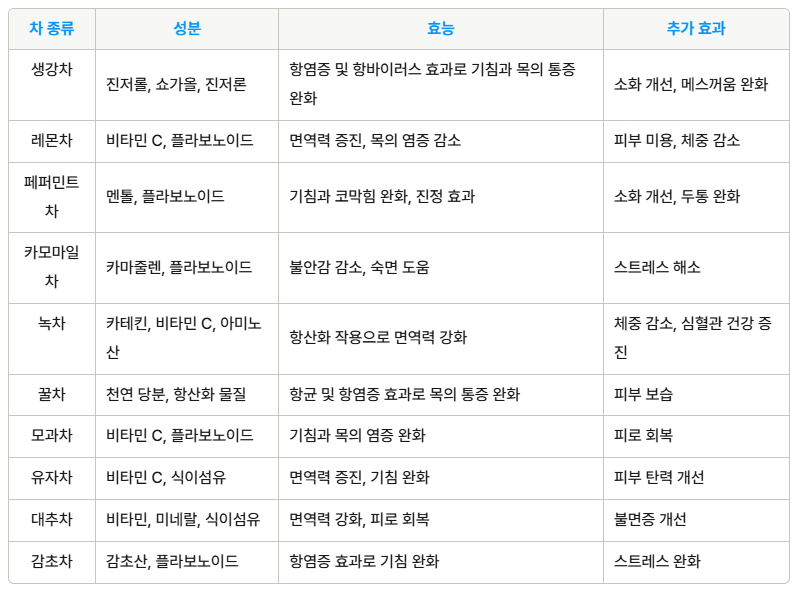 감기 증상을 완화하고 면역력을 높이기 위해 자연에서 얻을 수 있는 다양한 차가 있습니다. 오늘 포스팅 글에서는 감기에 좋은 10가지 차의 성분과 효능, 그리고 감기에 걸리지 않기 위한 예방 방법에 대해 알아보겠습니다.