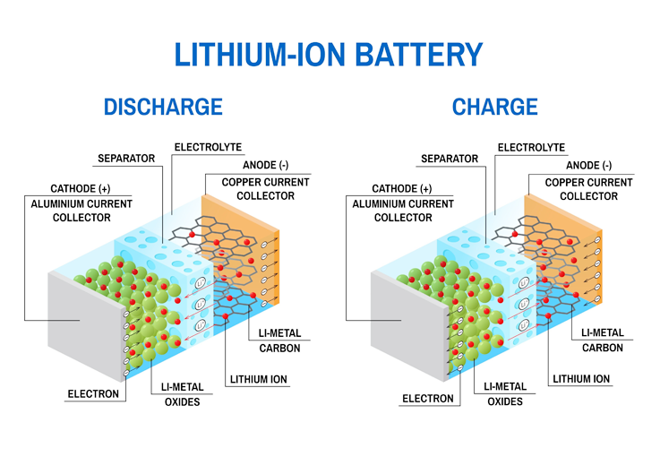 리튬 이온 배터리는 크게 양극(Cathode), 음극(Anode), 분리막(Separator), 그리고 전해액(Electrolyte)으로 구성되어 있습니다. 충전 및 방전 시 리튬 이온( Li⁺)이 양극과 음극을 오가며 전기를 발생시킵니다.