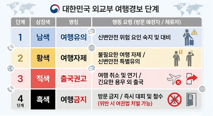 정부의 여행경보는 외교부(재외동포영사지원국)가 '여권정책심의위원회'의 엄격한 심의를 거쳐 결정하는 법적 가이드라인입니다. 각 단계가 가진 무게감을 정확히 알아야 '합리적 판단'이 가능합니다.