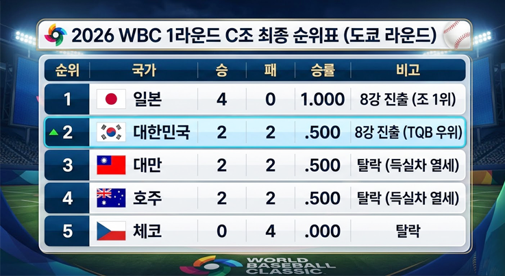 한국은 최종전에서 호주를 상대로 '5점 차 이상 승리'와 '2실점 이하'라는 까다로운 조건을 동시에 충족하며 TQB 싸움에서 극적으로 우위를 점했습니다.