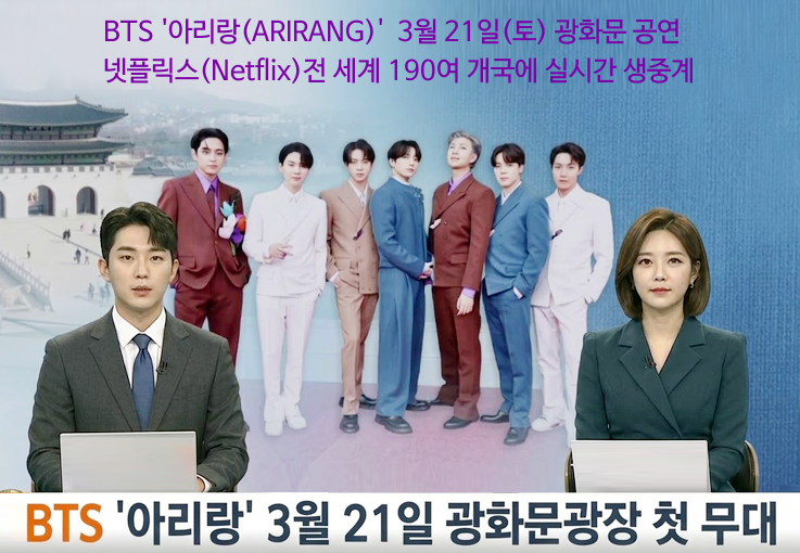 ○ 공연 내용 : 3월 20일에 발매되는 새 앨범 '아리랑'의 신곡 무대를 최초로 공개하며, 한국의 정체성과 전통을 담은 특별한 퍼포먼스를 선보일 예정입니다.