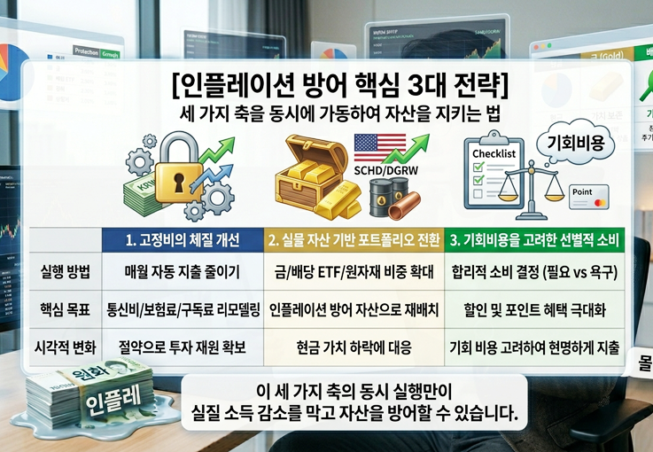 결론부터 요약하면 물가 상승(인플레이션) 대응의 핵심은 '고정비의 체질 개선', '실물 자산 기반의 포트폴리오 전환', 그리고 '기회비용을 고려한 선별적 소비'입니다. 이 세 가지 축을 동시에 가동해야만 실질 소득 감소를 막고 자산을 방어할 수 있습니다.