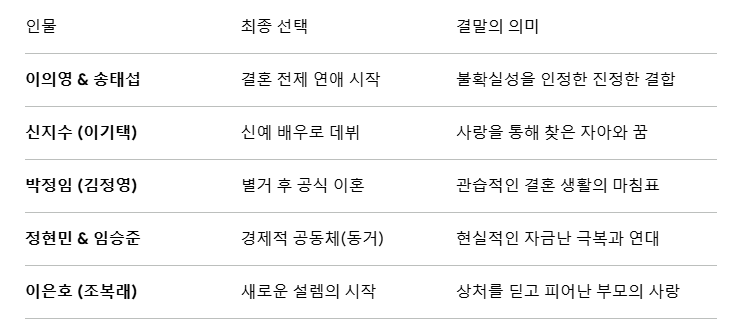 드라마 속 인물들은 각자의 방식대로 '홀로서기' 혹은 '함께하기'를 선택했습니다. 이를 표로 정리해 보았습니다.