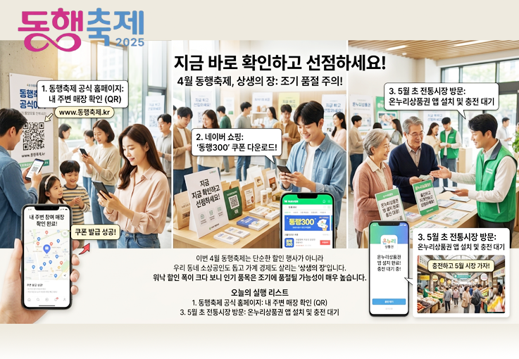 이번 4월 동행축제는 단순한 할인 행사가 아니라 우리 동네 소상공인도 돕고 가계 경제도 살리는 '상생의 장'입니다. 워낙 할인 폭이 크다 보니 인기 품목은 조기에 품절될 가능성이 매우 높습니다. 🏃♂