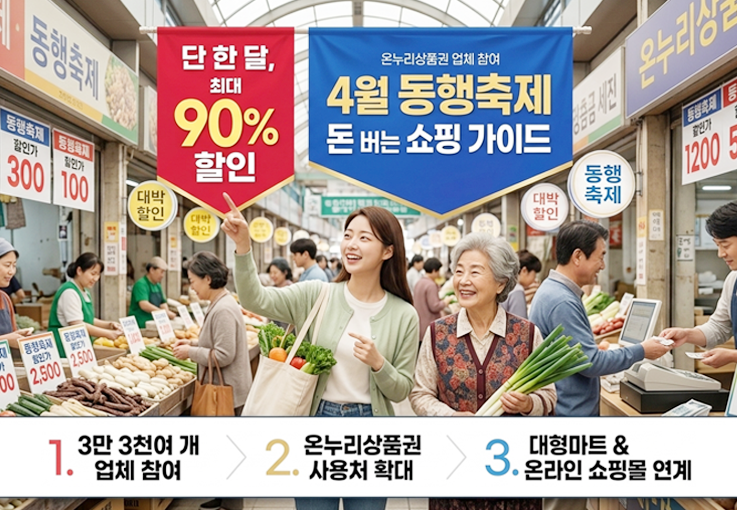 이런 위축된 내수 경제를 살리기 위해 정부가 칼을 빼 들었습니다. 오는 4월 11일부터 한 달간 전국 단위의 소비 촉진 행사인 ‘4월 동행축제’가 개최됩니다. 단순히 이름만 축제가 아니라, 참여 업체만 3만 3,000여 곳에 달하며 할인율은 무려 최대 90%까지 혜택을 제공합니다. 이번 기회를 놓치면 5월 가정의 달 지출 폭탄을 피하기 어려울지도 모릅니다. 지금부터 아는 사람만 누리는 핵심 혜택을 깔끔하게 정리해 드립니다.