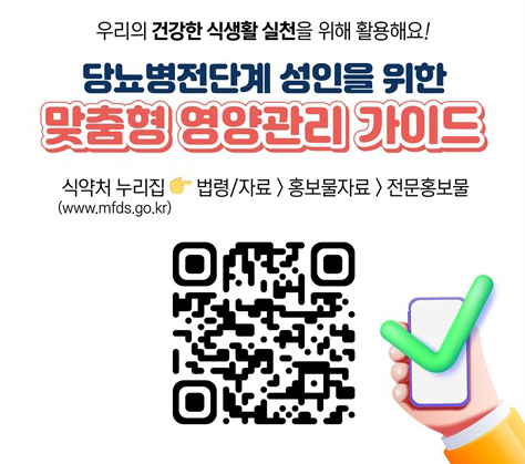 ※ 식약처 누리집( 법령/자료 > 홍보물자료 > 전문홍보물)에서 상세한 '당뇨 위험 성인을 위한 맞춤형 영양관리 가이드'를 확인하실 수 있습니다.