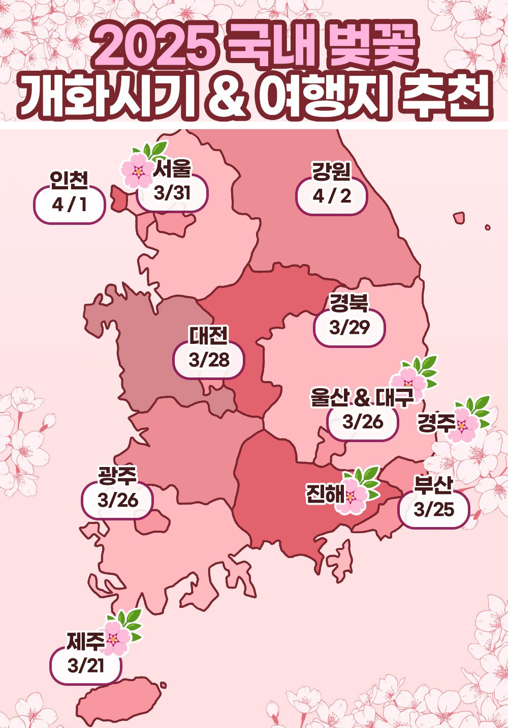 2025년 벚꽃은 지역별로 다르게 개화할 것으로 예상됩니다. 제주도에서 시작해 남부 지방, 중부 지역까지 순차적으로 피어나는 벚꽃을 확인해 보세요.